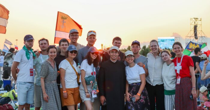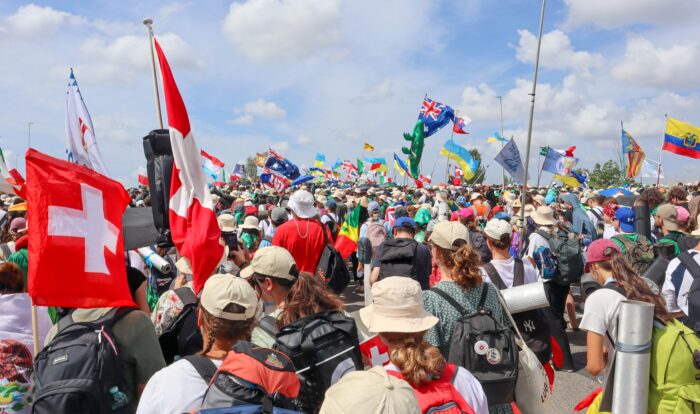 Am Samstag brachen wir schliesslich zum Abschlussfeld auf. Menschen, Fahnen und Lieder soweit das Auge reichte – und doch war die Atmosphäre friedlich. Die Sonne zeigte sich gnädig: Es war zwar heiss, aber nicht unerträglich, immer wieder zogen Wolken durch. Wir richteten uns auf unserem Platz ein – dann traf der Papst per Hubschrauber ein und fuhr im Papamobil durch die Reihen. Der Höhepunkt des Abends war die Vigil: In der Stille der Anbetung – unter freiem Himmel, umgeben von einer Million junger Menschen– schien die ganze Welt den Atem anzuhalten. Alle waren ausgerichtet auf Gott.